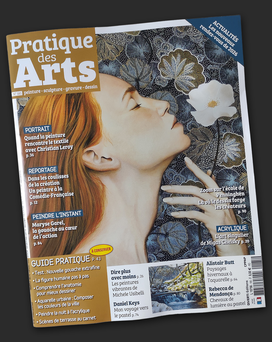 Pratique des Arts n°185 – Couverture et article Merci au magazine Pratique des Arts d’avoir mis mon travail à l’honneur dans son numéro 185 de février/mars 2026, avec le visuel de couverture et six pages intérieures ! Pour l’acheter, c’est ici : Divertistore Facebook Twitter Pinterest Email Print